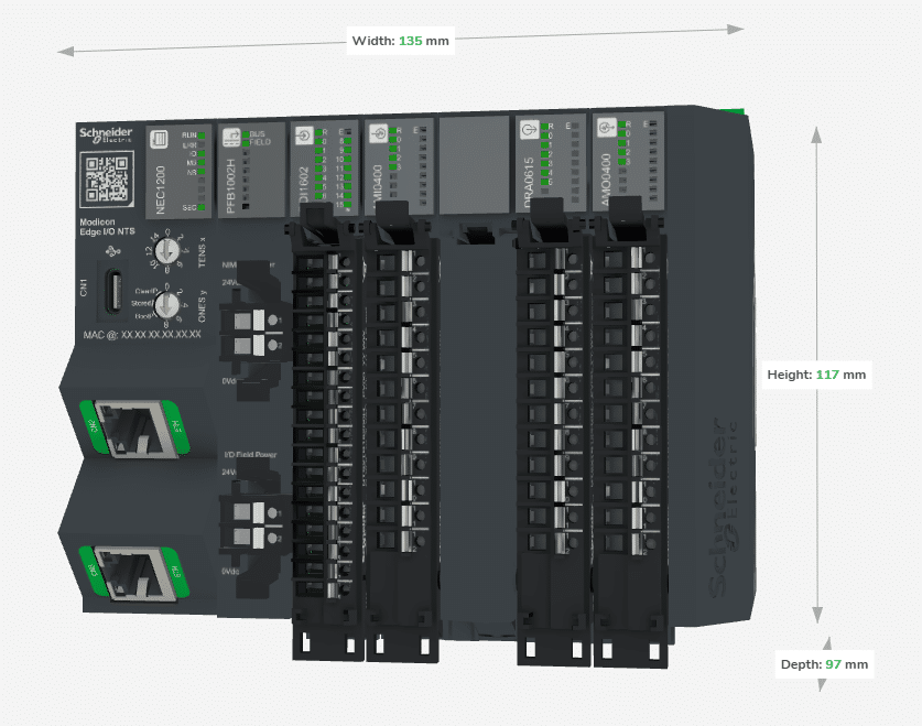 Tout d’abord, en ce qui concerne les dimensions, le Modicon Edge IO est à peine plus grand que la gamme TM3 et plus compact que l’Advantys STB :